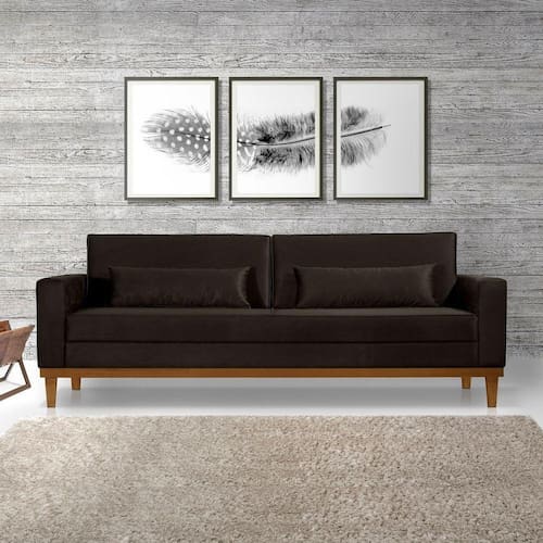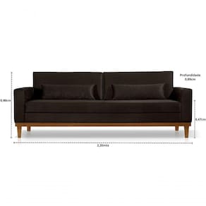 assento com espuma D26, manta acrílica e percintas de borracha, encosto fixo, sendo as almofadas maiores com espuma D26 + manta acrílica e almofadas menores de apoio com enchimento 100% plumante e percintas elásticas de apoio, cada braço mede 0,14cm de largura com espuma D26. Estrutura em madeira maciça de Eucalipto 100% reflorestamento, Tecido 100% Poliéster. Suporta até 110 kg distribuídos sobre a área do assento. Os tecidos podem sofrer alterações de tonalidade, dependendo do lote de produção e também em relação a tela do seu monitor/celular, produto produzido de forma artesanal podendo haver pequenas variações nas medidas, Os objetos de decoração que ambientam as fotos não acompanham o produto; Nossos produtos são padronizados, não permitindo qualquer personalização dos mesmo; certifique-se que o percurso que o produto fará permite a passagem, não nos responsabilizamos pela montagem/instalação do produto. Nos responsabilizamos pela entrega até a porta/portaria. Após a conclusão da entrega no endereço solicitado, o transporte até o local de uso ficara sob responsabilidade do cliente, caso neste momento haja problemas ou danos no produto, ficará a cargo do mesmo: As transportadoras não sobem escadas ou elevadores;