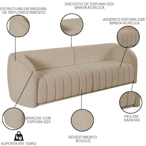 Altura: 77 cm | AssemblyRequired: Sim, sugerimos a contratação do nosso serviço de montagem (para os CEPs em que o serviço está dispon | Color: Bege | ColorFamily: Bege | ColorSimple: Bege | ColorSupplier: Bege | Cor: Bege | Gênero: Unisex | Largura: 292 cm | Manual: Sim | Marca: Mpozenato | Material: Madeira de Reflorestamento | MaterialFamily: Madeira de Reflorestamento | Model: Meris | Origem: Nacional | OriginCountry: Nacional | OriginState: PR | Peso: 84 kg | Peso Suportado: 240 Kg | ProductContents: 1 Sofá | ProductHeight: 77 | ProductInstructions: Produto para uso em ambiente interno, nao devendo ficar exposto ao sol, calor e umidade excessivos. | ProductLength: 86 | ProductWarranty: 90 dias após o recebimento do produto | ProductWeight: 84 | ProductWidth: 292 | Profundidade: 86 cm | Requere montagem: Sim | SizeDescription: 77 x 292 x 86 cm | SupplierSimpleName: Sofá Living Decorativo 3 Lugares 292cm Meris M22 Bouclê Bege - Mpozenato | Tipo de : Fabricante
