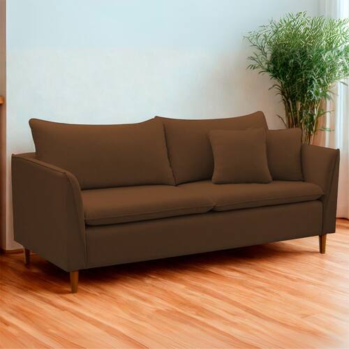 Sofá em veludo de toque macio, disponível em . Possui assento fixo com pillow top em espuma D26, estrutura reforçada em madeira de eucalipto com mola bonnel e percintas italianas. Conta com pés removíveis, encosto em fibra de silicone e acompanha almofadas decorativas.