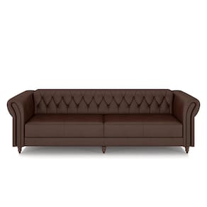 O revestimento em couro confere um aspecto luxuoso e elegante, refletindo o estilo clássico Chesterfield. Seus pés torneados fixos, em madeira maciça, adicionam um charme adicional e garantem estabilidade.