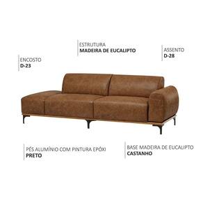 Características do Produto:Material da Estrutura: Madeira reflorestada de eucalipto, com partes em MDF e OSBMaterial do Assento: Espuma D-26 HR sobre percintas elásticasMaterial do Encosto: Espuma D-23 sobre percintas elásticasBraço: Espuma D-23Material da Base: Madeira de eucalipto envernizadaMaterial dos Pés: Alumínio com pintura epóxiTipo de Pés: FixoCor dos Pés: PretoCor da Base: CastanhoQuantidade de Pés: 05Revestimento: Corano PVCPeso Suportado: Até 100 kg por assento