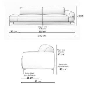 Outras Medidas:Altura do Encosto: 40 cmAltura do Assento ao Chão: 46 cmAltura do Braço: 20 cmAltura dos Pés: 18 cmLargura do Assento: 115 cmProfundidade Livre do Assento: 55 cmLargura do Braço: 25 cm