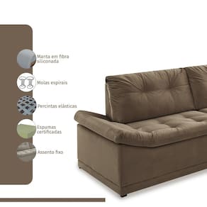 Assentos com espuma flexível de poliuretano densidade 29kg/m macia, certificada, fabricação própria, sustentados por percinta elástica. Enchimento do encosto: 100% fibra siliconadas. Estrutura de madeira maciça de pinus e eucalipto 100% reflorestada. Fixação da estrutura: grampos galvanizados anti-ferrugem. Apoiados no chão com sapatas de pvc. Revestimento/tecido: veludo 100% poliéster, com toque macio.