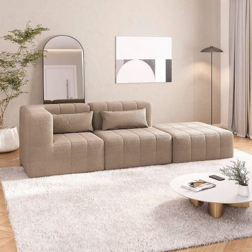 O acabamento em bouclé é o toque final de conforto e estilo, deixando o visual super moderno, mas com aquela sensação de acolhimento que a gente ama. E ainda tem mais: os módulos de canto e central vêm com almofadas decorativas inclusas, para dar aquele charme extra e garantir o conforto na medida certa.