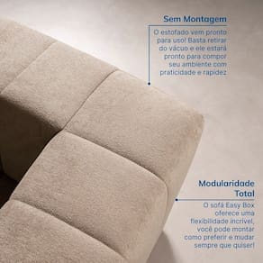 O sofá EasyBox é a definição de flexibilidade e estilo para quem adora inovar e criar seu próprio espaço. O nome já diz tudo: EasyBox vem da ideia de um sistema fácil e prático que você pode organizar e reorganizar como quiser, do seu jeito. Seja para criar um cantinho aconchegante, uma disposição em ?L? ou até mesmo uma ilha de assentos dupla face para aquela social com os amigos, o EasyBox se adapta ao que você precisar.