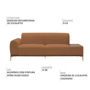 Madeira reflorestada de eucalipto, MDF, OSB, Espuma D-26 HR, Espuma D-23, Percintas elásticas, Pés em alumínio com pintura epóxi, Tampo envernizado.Características TécnicasEstrutura: Madeira reflorestada de eucalipto, com partes em MDF e OSB robustez e sustentabilidadeAssento: Espuma D-26 HR sobre percintas elásticas conforto firme e duradouroEncosto: Espuma D-23 sobre percintas elásticas apoio ergonômicoBraços: Espuma D-23 maciez e suporteMesa: Estrutura em madeira de eucalipto com bordas estofadas e tampo envernizadoBase/Pés: Madeira de eucalipto envernizada com pés em alumínio com pintura epóxiCor da Base/Pés: Castanho Natural / Ouro FoscoPeso Suportado: Até 100 kg por assento
