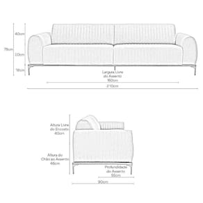 MedidasAltura Total: 78 cmLargura: 210 cmProfundidade: 90 cmPeso: 80 kgAltura do Encosto: 40 cmAltura do Assento ao Chão: 46 cmAltura do Braço: 20 cmAltura dos Pés: 18 cmLargura Livre do Assento: 160 cmProfundidade Livre do Assento: 55 cmLargura do Braço: 25 cm