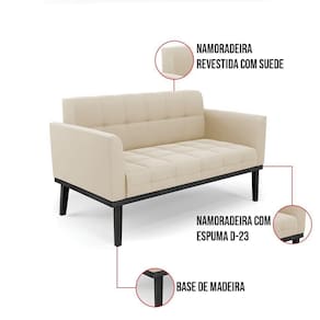 Você gosta de colecionar vários momentos memoráveis com sua família e amigos? Que tal recebê-los, com móveis de altíssima qualidade que só a D'Rossi tem? O Sofá Namoradeira Elisa é adequado para você! Seu design retrô é a grande tendência do momento. Pode ser utilizado em diversos espaços da casa, em salas, hall de entrada, quartos, cozinhas, varanda, sacada, escritório, dentre outros. Contém as seguintes características: A estrutura é feita de madeira de Eucalipto 100% de reflorestamento, e a Base de Madeira Preto, além de ser resistente e durável, suporta em média até 120 kg. Assento, encosto e braços, contém enchimento de espuma D-23 e é estofada em tecido Suede, que oferece muito conforto e resistência ao sentar, com aquela sensação de maciez e aconchego. Possui também, detalhes de costura no encosto e assento, resultando em um acabamento impecável, conferindo muito mais valor e elegância ao seu espaço. Para complementar a decoração com esse lindo Sofá Namoradeira, a dica é utilizar mantas, almofadas ou vasinho de flor. E pronto, seu cantinho estará perfeito para descansar e relaxar! Aqui, você encontra várias opções, para que seus amigos e familiares se sintam acolhidos. Garanta já seu Sofá Namoradeira.