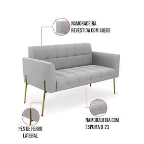 Você gosta de colecionar vários momentos memoráveis com sua família e amigos? Que tal recebê-los, com móveis de altíssima qualidade que só a D'Rossi tem? O Sofá Namoradeira Elisa é adequado para você! Seu design retrô é a grande tendência do momento. Pode ser utilizado em diversos espaços da casa, em salas, hall de entrada, quartos, cozinhas, varanda, sacada, escritório, dentre outros. Contém as seguintes características: A estrutura é feita Madeira de Eucalipto 100% de reflorestamento,Pés de Ferro Dourado que além de ser resistente e durável, suporta em média até 120 kg. Assento, encosto e braços, contém enchimento de espuma D-23 e é estofada em tecido Suede, no tom Cinza, que oferece muito conforto e resistência ao sentar, com aquela sensação de maciez e aconchego. Possui também, detalhes de costura no encosto e assento, resultando em um acabamento impecável, conferindo muito mais valor e elegância ao seu espaço. Para complementar a decoração com esse lindo Sofá Namoradeira, a dica é utilizar mantas, almofadas ou vasinho de flor. E pronto, seu cantinho estará perfeito para descansar e relaxar! Aqui, você encontra várias opções, para que seus amigos e familiares se sintam acolhidos. Garanta já seu Sofá Namoradeira.