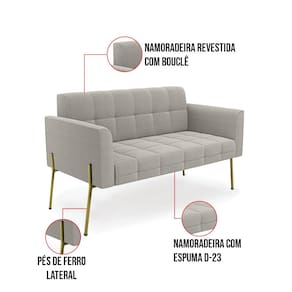 O Sofá Namoradeira 2 Lugares Elisa é uma mobília que combina elegância, conforto e durabilidade. Ele tem um design retrô e sofisticado, com Pés Laterais de Ferro Dourado e revestimento em tecido Bouclê Cinza, que harmonizam com qualquer ambiente. Ele é ideal para sala de estar, recepções, escritórios, cozinhas ou qualquer outro espaço que você queira decorar com estilo e bom gosto. Ele tem uma estrutura em madeira de reflorestamento eucalipto, que garante a resistência e a sustentabilidade do produto. Ele suporta até 180 kg de peso, podendo ser utilizada por pessoas de diferentes biotipos. Ele tem um acabamento reforçado e espuma de qualidade D23, que oferece maciez e aconchego. Ele contém detalhes de costura no encosto e assento, resultando em um acabamento impecável, conferindo muito mais valor e elegância ao produto. O Sofá Namoradeira Elisa é um móvel de alta qualidade, beleza e funcionalidade. Ele é fácil de transportar, pois tem um peso leve e um tamanho compacto. O Sofá Namoradeira Elisa é um produto que vai fazer a diferença na sua decoração e no seu bem-estar. Ele vai trazer charme, conforto e durabilidade para o seu ambiente. Aproveite essa oferta e leve para casa um Sofá Namoradeira de qualidade por um preço incrível. Essa é a sua chance de ter um Sofá Namoradeira maravilhoso por um preço imperdível. Corra e garanta o seu antes que acabe o estoque!