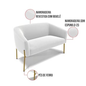 Tem novidades chegando por aqui! Olha só essa nossa inédita Namoradeira Stella Bouclê. Sim, as melhores opções em Namoradeira estão aqui! A Namoradeira Stella Bouclê é para todas as ocasiões, é ideal para você relaxar, assistir tv ou ler um livro, mantendo-o confortável ao longo do dia! Um estofado versátil, que foge do convencional pelo seu design e tecido luxuoso. Seu formato curvo, marcante e sofisticado, oferece conforto de forma excepcional, com aquela sensação de abraço, que deixa o coração quentinho! Desenvolvida com atenção aos detalhes, para atender todas suas expectativas e necessidades. Seu aspecto arredondado e anatômico, possibilita que a postura fique sempre alinhada, mantendo a coluna na posição correta. Ela dispõe de um acabamento impecável, revestida em Bouclê em tom Off White, um tecido maleável que além de ser muito bonito, é a grande tendência do momento, por ser uma lã mais refinada, quente, com toque suave e agradável, semelhante à textura natural da ovelha. Contém uma estrutura robusta, sua sustentação é dada pelos Pés de Ferro no tom Dourado, que garantem mais segurança e firmeza ao sentar-se. Já o enchimento é feito em espuma D-23 no encosto e assento, garantindo maior conforto ao usuário. Ah! Vale a pena lembrar que a Namoradeira Stella Bouclê, foi produzida em quantidades limitadas, para aqueles que procuram criar um visual diferenciado e exclusivo. Então, não deixe de aproveitar esse lançamento, hem! Leve a sua agora mesmo.