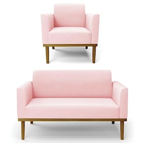O Sofá Namoradeira e 1 Poltrona Base Madeira Castanho Maressa Suede Rosa Bebê, da Ibiza é o conjunto ideal para quem busca beleza, conforto e versatilidade. Você pode usar na sua Sala De Estar, recepção ou qualquer outro ambiente que desejar.