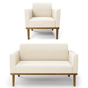 O Sofá Namoradeira e a Poltrona Decorativa são revestidos em Veludo, que é fácil de limpar e valoriza o design das peças. Eles têm braços e encosto em espuma D-18 e assento em espuma D-26, que oferecem firmeza e aconchego para você relaxar. A base em madeira de eucalipto castanho é um detalhe charmoso, que dá um toque rústico e sofisticado ao conjunto. O kit tem uma estrutura resistente e suporta até 120 kg cada peça. A montagem é simples, pois as peças já vêm prontas, bastando fixar a base com os parafusos que acompanham o produto. A limpeza é prática, pois basta usar um pano limpo e levemente úmido, sem produtos abrasivos, para manter o seu kit sempre em bom estado. Hora de transformar seu ambiente com a Namoradeira 2 Lugares e a Poltrona para Sala deixando ainda mais confortável e estiloso.