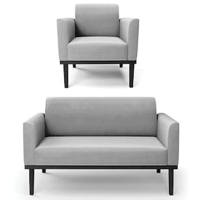 O Sofá Namoradeira e 1 Poltrona Base Madeira Preto Maressa Suede Cinza, da Ibiza é o conjunto ideal para quem busca beleza, conforto e versatilidade. Você pode usar na sua Sala De Estar, recepção ou qualquer outro ambiente que desejar.