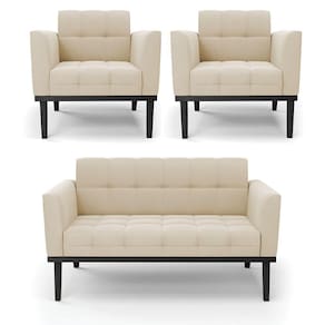 Você gosta de colecionar vários momentos memoráveis com sua família e amigos? Que tal recebê-los, com móveis de altíssima qualidade que só a D'Rossi tem? O Sofá Sofá Namoradeira e Poltrona Elisa é adequado para você! Seu design retrô é a grande tendência do momento. Pode ser utilizado em diversos espaços da casa, em salas, hall de entrada, quartos, cozinhas, varanda, sacada, escritório, dentre outros. Contém as seguintes características: A estrutura é feita de madeira de Eucalipto 100% de reflorestamento, e a Base de Madeira Fixa Preto, além de ser resistente e durável, suporta em média até 120 kg. Assento, encosto e braços, contém enchimento de espuma D-23 e é estofada em tecido Suede, no tom Bege, que oferece muito conforto e resistência ao sentar, com aquela sensação de maciez e aconchego. Possui também, detalhes de costura no encosto e assento, resultando em um acabamento impecável, conferindo muito mais valor e elegância ao seu espaço. Para complementar a decoração com esse lindo Kit Sofá Namoradeira e Poltrona Elisa, a dica é utilizar mantas, almofadas ou vasinho de flor. E pronto, seu cantinho estará perfeito para descansar e relaxar! Aqui, você encontra várias opções, para que seus amigos e familiares se sintam acolhidos. Garanta já seu Kit Sofá Namoradeira e 2 Poltronas Elisa.
