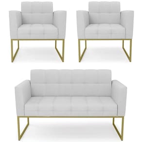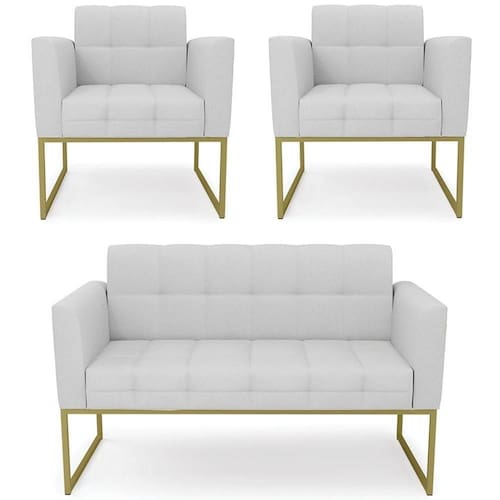 O Sofá Namoradeira e 2 Poltronas Base Industrial Dourado Ana Linho Cinza, da Ibiza é o conjunto ideal para quem busca beleza, conforto e versatilidade. Você pode usar na sua Sala De Estar, recepção ou qualquer outro ambiente que desejar.