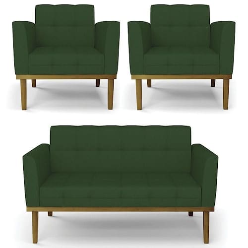 O Sofá Namoradeira e 2 Poltronas Base Madeira Castanho Ana Veludo Luxo Verde, da Ibiza é o conjunto ideal para quem busca beleza, conforto e versatilidade. Você pode usar na sua Sala De Estar, recepção ou qualquer outro ambiente que desejar.