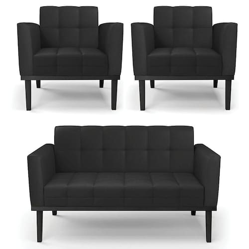 O Sofá Namoradeira e 2 Poltronas Base Madeira Preto Ana Sintético Preto, da Ibiza é o conjunto ideal para quem busca beleza, conforto e versatilidade. Você pode usar na sua Sala De Estar, recepção ou qualquer outro ambiente que desejar.