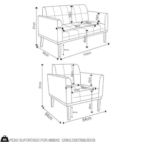 O Sofá Namoradeira e a Poltrona Decorativa são revestidos em Suede, que é fácil de limpar e valoriza o design das peças. Eles têm braços e encosto em espuma D-18 e assento em espuma D-26, que oferecem firmeza e aconchego para você relaxar. A base em madeira de eucalipto Preto é um detalhe charmoso, que dá um toque rústico e sofisticado ao conjunto. O kit tem uma estrutura resistente e suporta até 120 kg cada peça. A montagem é simples, pois as peças já vêm prontas, bastando fixar a base com os parafusos que acompanham o produto. A limpeza é prática, pois basta usar um pano limpo e levemente úmido, sem produtos abrasivos, para manter o seu kit sempre em bom estado. Hora de transformar seu ambiente com a Namoradeira 2 Lugares e a Poltrona para Sala deixando ainda mais confortável e estiloso.