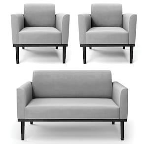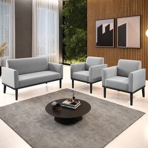 O Sofá Namoradeira e 2 Poltronas Base Madeira Preto Maressa Suede Cinza, da Ibiza é o conjunto ideal para quem busca beleza, conforto e versatilidade. Você pode usar na sua Sala De Estar, recepção ou qualquer outro ambiente que desejar.