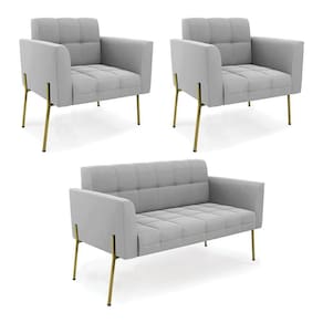 Você gosta de colecionar vários momentos memoráveis com sua família e amigos? Que tal recebê-los, com móveis de altíssima qualidade que só a D'Rossi tem? O Sofá Sofá Namoradeira e Poltrona Elisa é adequado para você! Seu design retrô é a grande tendência do momento. Pode ser utilizado em diversos espaços da casa, em salas, hall de entrada, quartos, cozinhas, varanda, sacada, escritório, dentre outros. Contém as seguintes características: A estrutura é feita Madeira de Eucalipto 100% de reflorestamento,Pés de Ferro Dourado que além de ser resistente e durável, suporta em média até 120 kg. Assento, encosto e braços, contém enchimento de espuma D-23 e é estofada em tecido Suede, no tom Cinza, que oferece muito conforto e resistência ao sentar, com aquela sensação de maciez e aconchego. Possui também, detalhes de costura no encosto e assento, resultando em um acabamento impecável, conferindo muito mais valor e elegância ao seu espaço. Para complementar a decoração com esse lindo Kit Sofá Namoradeira e Poltrona Elisa, a dica é utilizar mantas, almofadas ou vasinho de flor. E pronto, seu cantinho estará perfeito para descansar e relaxar! Aqui, você encontra várias opções, para que seus amigos e familiares se sintam acolhidos. Garanta já seu Kit Sofá Namoradeira e 2 Poltronas Elisa.