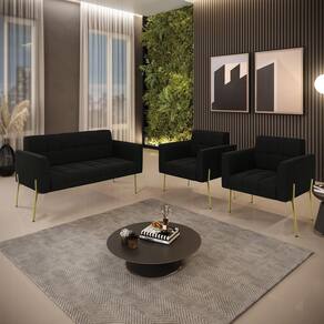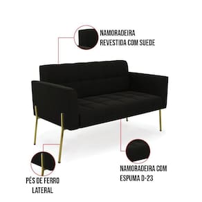 Sofá Namoradeira E 2 Poltronas Pé De Ferro Dourado Elisa Suede D03 - D'rossi Cor Preto