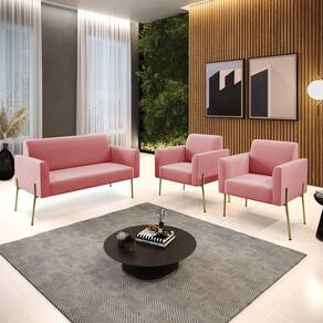 Sofá Namoradeira e 2 Poltronas Pé de Ferro Dourado Marisa Suede D03 - D`Rossi - Rosê