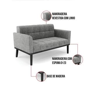 Você gosta de colecionar vários momentos memoráveis com sua família e amigos? Que tal recebê-los, com móveis de altíssima qualidade que só a D'Rossi tem? O Sofá Sofá Namoradeira e Poltrona Elisa é adequado para você! Seu design retrô é a grande tendência do momento. Pode ser utilizado em diversos espaços da casa, em salas, hall de entrada, quartos, cozinhas, varanda, sacada, escritório, dentre outros. Contém as seguintes características: A estrutura é feita de madeira de Eucalipto 100% de reflorestamento, e a Base de Madeira Fixa Preto, além de ser resistente e durável, suporta em média até 120 kg. Assento, encosto e braços, contém enchimento de espuma D-23 e é estofada em tecido Linho, que oferece muito conforto e resistência ao sentar, com aquela sensação de maciez e aconchego. Possui também, detalhes de costura no encosto e assento, resultando em um acabamento impecável, conferindo muito mais valor e elegância ao seu espaço. Para complementar a decoração com esse lindo Kit Sofá Namoradeira e Poltrona Elisa, a dica é utilizar mantas, almofadas ou vasinho de flor. E pronto, seu cantinho estará perfeito para descansar e relaxar! Aqui, você encontra várias opções, para que seus amigos e familiares se sintam acolhidos. Garanta já seu Kit Sofá Namoradeira e Poltrona Elisa.
