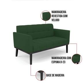 Você gosta de colecionar vários momentos memoráveis com sua família e amigos? Que tal recebê-los, com móveis de altíssima qualidade que só a D'Rossi tem? O Sofá Sofá Namoradeira e Poltrona Elisa é adequado para você! Seu design retrô é a grande tendência do momento. Pode ser utilizado em diversos espaços da casa, em salas, hall de entrada, quartos, cozinhas, varanda, sacada, escritório, dentre outros. Contém as seguintes características: A estrutura é feita de madeira de Eucalipto 100% de reflorestamento, e a Base de Madeira Fixa Preto, além de ser resistente e durável, suporta em média até 120 kg. Assento, encosto e braços, contém enchimento de espuma D-23 e é estofada em tecido Veludo, que oferece muito conforto e resistência ao sentar, com aquela sensação de maciez e aconchego. Possui também, detalhes de costura no encosto e assento, resultando em um acabamento impecável, conferindo muito mais valor e elegância ao seu espaço. Para complementar a decoração com esse lindo Kit Sofá Namoradeira e Poltrona Elisa, a dica é utilizar mantas, almofadas ou vasinho de flor. E pronto, seu cantinho estará perfeito para descansar e relaxar! Aqui, você encontra várias opções, para que seus amigos e familiares se sintam acolhidos. Garanta já seu Kit Sofá Namoradeira e Poltrona Elisa.