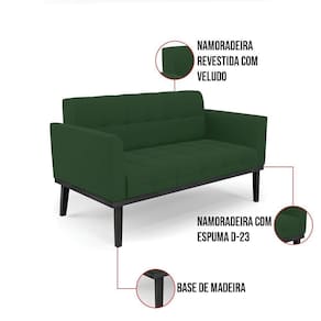 Você gosta de colecionar vários momentos memoráveis com sua família e amigos? Que tal recebê-los, com móveis de altíssima qualidade que só a D'Rossi tem? O Sofá Sofá Namoradeira e Poltrona Elisa é adequado para você! Seu design retrô é a grande tendência do momento. Pode ser utilizado em diversos espaços da casa, em salas, hall de entrada, quartos, cozinhas, varanda, sacada, escritório, dentre outros. Contém as seguintes características: A estrutura é feita de madeira de Eucalipto 100% de reflorestamento, e a Base de Madeira Fixa Preto, além de ser resistente e durável, suporta em média até 120 kg. Assento, encosto e braços, contém enchimento de espuma D-23 e é estofada em tecido Veludo, na cor Verde, que oferece muito conforto e resistência ao sentar, com aquela sensação de maciez e aconchego. Possui também, detalhes de costura no encosto e assento, resultando em um acabamento impecável, conferindo muito mais valor e elegância ao seu espaço. Para complementar a decoração com esse lindo Kit Sofá Namoradeira e Poltrona Elisa, a dica é utilizar mantas, almofadas ou vasinho de flor. E pronto, seu cantinho estará perfeito para descansar e relaxar! Aqui, você encontra várias opções, para que seus amigos e familiares se sintam acolhidos. Garanta já seu Kit Sofá Namoradeira e Poltrona Elisa.