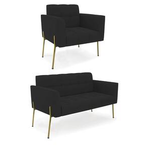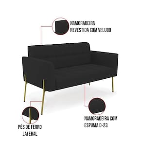 Você gosta de colecionar vários momentos memoráveis com sua família e amigos? Que tal recebê-los, com móveis de altíssima qualidade que só a D'Rossi tem? O Sofá Sofá Namoradeira e Poltrona Elisa é adequado para você! Seu design retrô é a grande tendência do momento. Pode ser utilizado em diversos espaços da casa, em salas, hall de entrada, quartos, cozinhas, varanda, sacada, escritório, dentre outros. Contém as seguintes características: A estrutura é feita Madeira de Eucalipto 100% de reflorestamento, Pés de Ferro Dourado que além de ser resistente e durável, suporta em média até 120 kg. Assento, encosto e braços, contém enchimento de espuma D-23 e é estofada em tecido Veludo, na cor Preto, que oferece muito conforto e resistência ao sentar, com aquela sensação de maciez e aconchego. Possui também, detalhes de costura no encosto e assento, resultando em um acabamento impecável, conferindo muito mais valor e elegância ao seu espaço. Para complementar a decoração com esse lindo Kit Sofá Namoradeira e Poltrona Elisa, a dica é utilizar mantas, almofadas ou vasinho de flor. E pronto, seu cantinho estará perfeito para descansar e relaxar! Aqui, você encontra várias opções, para que seus amigos e familiares se sintam acolhidos. Garanta já seu Kit Sofá Namoradeira e Poltrona Elisa.