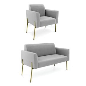Sofá Namoradeira E Poltrona Pé De Ferro Dourado Marisa Suede D03 Cinza - Blush