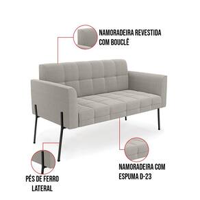 O Sofá Namoradeira e Poltrona Elisa é uma mobília que combina elegância, conforto e durabilidade. Ele tem um design retrô e sofisticado, com Pés Laterais de Ferro Preto e revestimento em tecido Bouclê Cinza, que harmonizam com qualquer ambiente. Ele é ideal para sala de estar, recepções, escritórios, cozinhas ou qualquer outro espaço que você queira decorar com estilo e bom gosto. Ele tem uma estrutura em madeira de reflorestamento eucalipto, que garante a resistência e a sustentabilidade do produto. Ele suporta até 180 kg de peso, podendo ser utilizada por pessoas de diferentes biotipos. Ele tem um acabamento reforçado e espuma de qualidade D23, que oferece maciez e aconchego. Ele contém detalhes de costura no encosto e assento, resultando em um acabamento impecável, conferindo muito mais valor e elegância ao produto. O Sofá Namoradeira e Poltrona Elisa é um móvel de alta qualidade, beleza e funcionalidade. Ele é fácil de transportar, pois tem um peso leve e um tamanho compacto. O Sofá Namoradeira e Poltrona Elisa é um produto que vai fazer a diferença na sua decoração e no seu bem-estar. Ele vai trazer charme, conforto e durabilidade para o seu ambiente. Aproveite essa oferta e leve para casa um Sofá Namoradeira e Poltrona de qualidade por um preço incrível. Essa é a sua chance de ter um Sofá Namoradeira e Poltrona maravilhoso por um preço imperdível. Corra e garanta o seu antes que acabe o estoque!