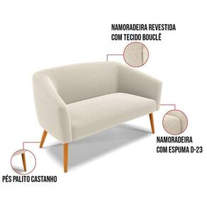 Tem novidades chegando por aqui! Olha só essa nossa inédita Namoradeira e Poltrona Stella Bouclê. Sim, as melhores opções em Namoradeira estão aqui! A Namoradeira e Poltrona Stella Bouclê é para todas as ocasiões, é ideal para você relaxar, assistir tv ou ler um livro, mantendo-o confortável ao longo do dia! Um estofado versátil, que foge do convencional pelo seu design e tecido luxuoso. Seu formato curvo, marcante e sofisticado, oferece conforto de forma excepcional, com aquela sensação de abraço, que deixa o coração quentinho! Desenvolvida com atenção aos detalhes, para atender todas suas expectativas e necessidades. Seu aspecto arredondado e anatômico, possibilita que a postura fique sempre alinhada, mantendo a coluna na posição correta. Ela dispõe de um acabamento impecável, revestida em Bouclê, um tecido maleável que além de ser muito bonito, é a grande tendência do momento, por ser uma lã mais refinada, quente, com toque suave e agradável, semelhante à textura natural da ovelha. Contém uma estrutura robusta, sua sustentação é dada pelos Pés Palito no tom Castanho, que garantem mais segurança e firmeza ao sentar-se. Já o enchimento é feito em espuma D-23 no encosto e assento, garantindo maior conforto ao usuário. Ah! Vale a pena lembrar que a Namoradeira e Poltrona Stella Bouclê, foi produzida em quantidades limitadas, para aqueles que procuram criar um visual diferenciado e exclusivo. Então, não deixe de aproveitar esse lançamento, hem! Leve a sua agora mesmo. Dimensões da Poltrona: Altura Total: 81 cm Largura Total: 69 cm Profundidade Total: 60 cm Altura do Encosto: 40 cm Largura do Assento: 45 cm Profundidade do Assento: 45 cm Altura do chão ao Assento: 45 cm Espessura do Assento: 15 cm Espessura do braço: 7 cm Altura do chão ao braço: 70 cm Altura interna do braço: 28 cm Tamanho dos pés: 45 cm Peso: 16 kg Dimensões da Namoradeira: Altura Total: 80 cm Largura Total: 120 cm Profundidade Total: 63 cm Altura do Encosto: 39 cm Largura do Assento: 100 cm Profundidade do Assento: 45 cm Altura do chão ao Assento: 45 cm Espessura do Assento: 15 cm Espessura do braço: 13 cm Altura do chão ao braço: 70 cm Altura interna do braço: 25 cm Tamanho dos pés: 30 cm Peso: 24 kg Especificações do Produto: Estrutura: Madeira Eucalipto Espuma: D-23 Tecido: Bouclê Peso Suportado: Até 180 Kg Tipo de Pés: Pés Palito Castanho Tipo de Encosto: Fixo Tipo de Assento: Fixo Complexidade da Montagem: Baixo Montagem: O produto vai montado, apenas rosquear os Pés Garantia: 90 dias contra defeito de fabricação Instruções de Limpeza: Utilizar um pano limpo e levemente úmido Você irá Receber: 01 Sofá Namoradeira e 01 Poltrona - Entregue em: 02 Volumes