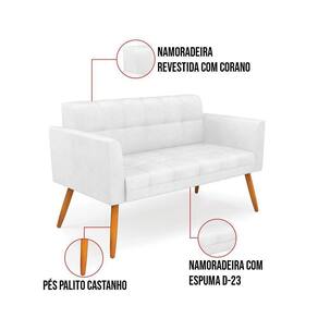 Você gosta de colecionar vários momentos memoráveis com sua família e amigos? Que tal recebê-los, com móveis de altíssima qualidade que só a DRossi tem? A Namoradeira 2 Lugares Elisa é adequada para você! Seu design retrô é a grande tendência do momento. Pode ser usada em diversos espaços da casa, em salas, hall de entrada, quartos, cozinhas, varanda, sacada, escritório, dentre outros. Contém as seguintes características: A estrutura é feita de madeira de Eucalipto 100% de reflorestamento, e os Pés Palito Castanho, além de serem resistentes e duráveis, suportam em média até 120 kg. Assento, encosto e braços, contém enchimento de espuma D-23 e é estofada em tecido Corano, no tom Branco, que oferece muito conforto e resistência ao sentar, com aquela sensação de maciez e aconchego. Possui também, detalhes de costura no encosto e assento, resultando em um acabamento impecável, conferindo muito mais valor e elegância ao seu espaço. Para complementar a decoração com essa linda namoradeira, a dica é utilizar mantas, almofadas ou vasinho de flor. E pronto, seu cantinho estará perfeito para descansar e relaxar! Aqui, você encontra várias opções, para que seus amigos e familiares se sintam acolhidos. Garanta já sua Namoradeira Elisa.
