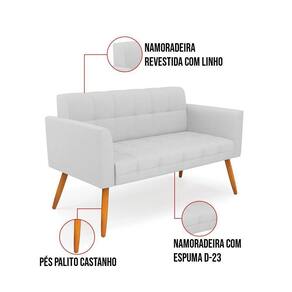 Você gosta de colecionar vários momentos memoráveis com sua família e amigos? Que tal recebê-los, com móveis de altíssima qualidade que só a DRossi tem? A Namoradeira 2 Lugares Elisa é adequada para você! Seu design retrô é a grande tendência do momento. Pode ser usada em diversos espaços da casa, em salas, hall de entrada, quartos, cozinhas, varanda, sacada, escritório, dentre outros. Contém as seguintes características: A estrutura é feita de madeira de Eucalipto 100% de reflorestamento, e os Pés Palito Castanho, além de serem resistentes e duráveis, suportam em média até 120 kg. Assento, encosto e braços, contém enchimento de espuma D-23 e é estofada em tecido Linho, no tom Cinza, que oferece muito conforto e resistência ao sentar, com aquela sensação de maciez e aconchego. Possui também, detalhes de costura no encosto e assento, resultando em um acabamento impecável, conferindo muito mais valor e elegância ao seu espaço. Para complementar a decoração com essa linda namoradeira, a dica é utilizar mantas, almofadas ou vasinho de flor. E pronto, seu cantinho estará perfeito para descansar e relaxar! Aqui, você encontra várias opções, para que seus amigos e familiares se sintam acolhidos. Garanta já sua Namoradeira Elisa. Dimensões da Sofá Namoradeira: Altura total: 80 cm Largura total: 112 cm Profundidade total: 65 cm Altura do encosto: 36 cm Largura do assento: 94 cm Profundidade do assento: 47 cm Altura do chão ao assento: 46 cm Espessura do assento: 16 cm Tamanho dos pés: 30 cm Espessura do braço: 9 cm Peso: 19 kg Especificações do Produto Estrutura: Madeira Eucalipto Espuma: D-23 Tecido: Linho Tipo de pés: Pés Palito Castanho Peso suportado: Até 120 Kg Garantia: 90 dias contra defeito de fabricação Montagem: O produto vai montado, apenas rosquear os pés Instruções de limpeza: Utilizar um pano limpo e levemente úmido Você irá receber: 01 Sofá Namoradeira - Entregue em: 01 Volume Observações Relevantes - Todos os produtos vão embalados com total segurança; - As cores dos produtos podem sofrer alterações dependendo do seu monitor; - Para futuras compras, não garantimos a mesma tonalidade de cor, pois existe variação a cada lote do fabricante do tecido; - As imagens são meramente ilustrativas, não acompanham objetos de decoração e eletros; - Confira as dimensões do produto no momento da compra e certifique-se de que passará normalmente por escadas, elevadores, portas e corredores; - Importante: Por se tratar de estofado as medidas podem ter uma pequena variação em até 3 cm; - Não nos responsabilizamos no ato da entrega por montagens, desmontagens, instalações de produtos; - Não nos responsabilizamos no ato da entrega por subir escadas, elevadores, nem utilização de guinchos ou equipamentos similares para acesso a pisos superiores em apartamentos; - A entrega do produto é realizada em todo território nacional, até onde as rodovias alcançam, entregas fluviais ou aéreas devem ser cotadas a parte; - Observando as orientações acima, evita-se futuros desagrados ou imprevistos com a entrega do produto. Havendo despesas adicionais, serão de responsabilidade do cliente;