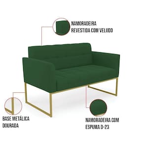 Você gosta de colecionar vários momentos memoráveis com sua família e amigos? Que tal recebê-los, com móveis de altíssima qualidade que só a DRossi tem? A Namoradeira 2 Lugares Elisa é adequada para você! Seu design retrô é a grande tendência do momento. Pode ser usada em diversos espaços da casa, em salas, hall de entrada, quartos, cozinhas, varanda, sacada, escritório, dentre outros. Contém as seguintes características: A estrutura é feita de madeira de Eucalipto 100% de reflorestamento, e a Base Metálica Industrial Dourado, além de ser resistente e durável, suporta em média até 120 kg. Assento, encosto e braços, contém enchimento de espuma D-23 e é estofada em tecido Veludo, no tom Verde, que oferece muito conforto e resistência ao sentar, com aquela sensação de maciez e aconchego. Possui também, detalhes de costura no encosto e assento, resultando em um acabamento impecável, conferindo muito mais valor e elegância ao seu espaço. Para complementar a decoração com essa linda namoradeira, a dica é utilizar mantas, almofadas ou vasinho de flor. E pronto, seu cantinho estará perfeito para descansar e relaxar! Aqui, você encontra várias opções, para que seus amigos e familiares se sintam acolhidos. Garanta já sua Namoradeira Elisa.