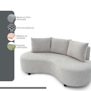 Assentos com espuma flexível de poliuretano densidade 29kg/m macia certificada, de fabricação própria, sustentados por percinta elástica. Almofada de Encosto em fibra siliconada. Estrutura de madeira maciça de eucalipto 100% reflorestada. Fixação da estrutura: grampos galvanizados anti-ferrugem. Apoiados no chão com pés em madeira de 8 cm. Revestimento/tecido: Boucle 100% poliéster, com toque macio.
