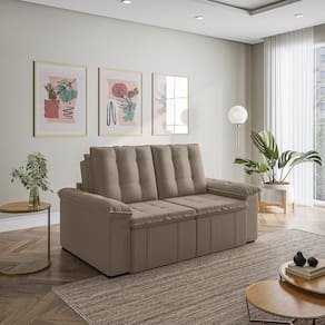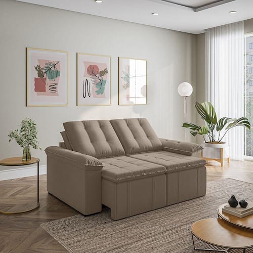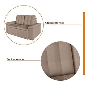 Sofá Palmeira Retrátil Reclinável sem caixa é a solução perfeita para quem tem pouco espaço disponível. Com ele você poderá acomodar suas visitas com conforto e praticidade em ambientes pequenos, a otimização do espaço é um ponto chave para garantir maior conforto e mobilidade. O sofá Palmeira possui braços de apenas 15cm de largura, proporcionando um maior aproveitamento da área disponível na sua sala de estar. Produzido em madeira maciça de eucalipto. Depois nos conte como foi a experiência de compra e como ficou seu ambiente nos comentários. Acompanha Almofadas extras: Não Almofada do assento: Fixa Almofada do encosto: Removível Altura do assento até o chão: 48 Altura do Encosto: 58 Altura dos Pés: 3 Ambiente Principal: Sala de Estar Complexidade da Montagem: Baixa: pode ser montado por uma pessoa sozinha Cor: Castor Cor do Produto: Castor Densidade do Assento: D-24 Densidade do Encosto: Camadas de Densidades Diferentes Enchimento do Assento: Espuma Enchimento do Encosto: Fibra Siliconada Estilo de Braço: Braços Pillow Top Firmeza do Assento: Médio Informações Complementares: Sofá sem caixa que otimiza o espaço Itens Inclusos: Sofa, 08 pés, Manual de Montagem Linha ou Coleção: Palmeira Manual de Montagem e Instalação: https://cdn2.madeiramadeira.com.br/atributo/takei-estofados/1544732-manual-sofapalmeira180-200-220.pdf Material dos Pés: PVC Necessita Montagem: Sim Origem do Produto: Nacional Peso: 69 Pet Friendly: Não Possui Entrada USB: Não Possui Percintas Elásticas: Sim Possui Pés: 08 Possui Rodízio: Sim Profundidade Quando Estendido: 134 Recomendações de Uso, Manutenção e Limpeza: Evitar exposição direta à luz solar, limpar com escova macia e aspirar o pó semanalmente, não utilizar produtos químicos, removedores, alvejantes, etc. Evite exercer pressão excessiva sobre determinada partes do estofado, não utilizar para limpeza equipamentos a vapor de água. Rodízio com Trava: Não Sistema de Montagem: Encaixe Suporta Até (kg): 300 Tecido Predominante: Veludo Tipo de Encosto: Regulável Tipo de Mola: Molas Bonnel Ean: 7909903442548