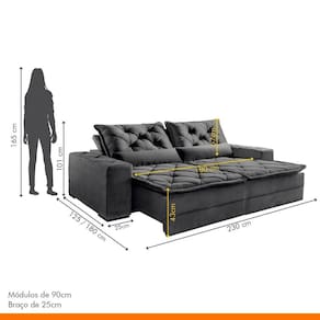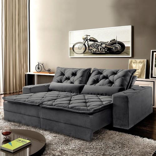 O assento de pillow com espuma elástica D28 certificada, a base do assento com molas espirais e percinta elástica de alta resistência. Possui também mecanismo retrátil em aço que permite abertura do sofá para sua maior comodidade.