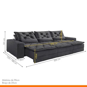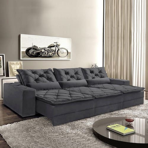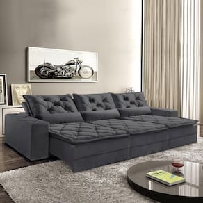 O Estofado Retrátil e Reclinável Dallas é um produto super confortável que vai proporcionar seu relaxamento depois de um dia cansativo. Com sua espuma D-28 de qualidade altíssima, a resistência e o aconchego são garantidos. Almofada do assento: Fixa Almofada do encosto: Fixa Altura do assento até o chão: 43 Altura do Encosto: 57 Altura dos Pés: 2,5 Ambiente Principal: Sala de Estar Complexidade da Montagem: Baixa: pode ser montado por uma pessoa sozinha Cor: Veludo Grafite Cor do Produto: Veludo Grafite Densidade do Assento: D-28 Densidade do Encosto: Camadas de Densidades Diferentes Enchimento do Assento: Espuma Enchimento do Encosto: Fibra Siliconada Estilo de Braço: Braços Quadrados Firmeza do Assento: Firme Informações Complementares: Itens Inclusos: 1 Sofá, Kit Pés e Manual de Montagem Largura do Sofá Maior: Linha ou Coleção: Manual de Especificação Técnica: Manual de Montagem e Instalação: https://cdn2.madeiramadeira.com.br/prd/montano-estofados/844888-montagem.pdf Material dos Pés: Pinus Montagem Flex: Não Necessita Montagem: Sim Origem do Produto: Nacional Peso: 132,3 Pet Friendly: Não Possui Percintas Elásticas: Sim Possui Pés: 08 Possui Rodízio: Sim Profundidade Quando Estendido: 180 Recomendações de Uso, Manutenção e Limpeza: A limpeza do revestimento deve ser feita com escova ou tecido de algodão branco levemente umedecidos em água morna, sabão neutro ou produto específico. Não usar produtos corrosivos nem a base de solventes, como: cloro, alvejantes, detergentes, entre outros;Não expor o estofado à luz direta. Mantenha portas e janelas sempre protegidas com cortinas e blackout. A exposição contínua à radiação da luz, danifica o revestimento, apodrecendo os fios, trincando a superfície e desbotando as cores;Não lavar o revestimento das almofadas pois pode desfiá-las, abrindo as costuras;Não utilizar o estofado para fins diferentes do que foi projetado: ficar em pé, pular, arrastar, sentar nos braços, peso na caixa traseira, entre outros tipos de ações que poderão danificar o produto. Resistente à Chuva: Não Revestimento do Braço: madeira maciça, MDF, espuma, pet fon e tecido Rodízio com Trava: não Sistema de Montagem: Parafusos Suporta Até (kg): 300 Tecido Predominante: Veludo Tipo de Encosto: Regulável Tipo de Madeira Maciça da Estrutura: Eucalipto Tipo de Mola: Molas Espirais