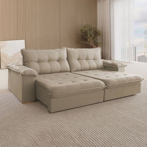 Este sofá retrátil estofado em linho oferece o máximo em conforto e praticidade, com braços almofadados que adicionam um toque extra de aconchego. Seu encosto com reclinação de 90 graus permite ajustar a posição para relaxamento ideal. O design moderno e funcional faz dele a escolha perfeita para quem busca um mobiliário versátil e elegante. Ideal para otimizar o espaço sem sacrificar o estilo. Produto Montado: Sim Acompanha Almofadas extras: Não Almofada do assento: Fixa Almofada do encosto: Removível Altura do assento até o chão: 45.0000 Altura do Encosto: 105 cm Ambiente Principal: Sala de Estar codigo_ean: 7909903856062 Complexidade da Montagem: Baixa: pode ser montado por uma pessoa sozinha Consistência do Assento: Macio Cor: Bege Cor do Produto: Bege Densidade do Assento: D-28 Enchimento do Assento: Espuma Firmeza do Assento: Macio Itens Inclusos: 1 sofá retrátil. Linha ou Coleção: Muriaé Material dos Pés: Madeira Maciça Necessita Montagem: Sim Peso: 109 kg Pet Friendly: Não Possui Percintas Elásticas: Sim Possui Pés: 08 Possui Rodízio: Sim Recomendações de Uso, Manutenção e Limpeza: Um pano seco e um pano levemente umedecido, evitar alvejantes e produtos de limpeza. Rodízio com Trava: Não Sistema de Montagem: Encaixe. Suporta Até (kg): 120 kg Tecido Predominante: Linho Tipo de Encosto: Regulável Tipo de Mola: Molas Nozag