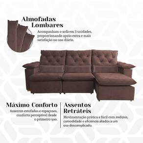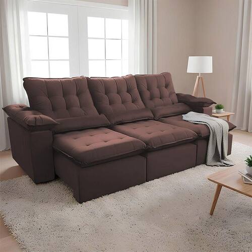 ATENÇÃO: IMAGENS MERAMENTE ILUSTRATIVAS. AS CORES PODEM VARIAR DE ACORDO COM A TELA, MONITOR, ILUMINAÇÃO DO AMBIENTE OU PERCEPÇÃO VISUAL.Sofà RetrÃtil 2.10m ReclinÃvel em Suede Aveludado Conforto Premium para Sala Europa Marrom