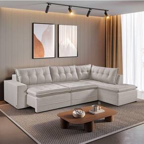 Sofá Retratil Com Chaise Direita Titan 7 Lugares 3,56m Tecido Linho Cor Cru 2320