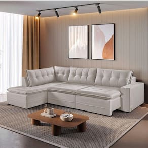 Sofá Retratil Com Chaise Esquerda Titan 6 Lugares 2,96m Tecido Linho Cor Cru 2320