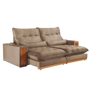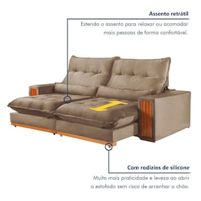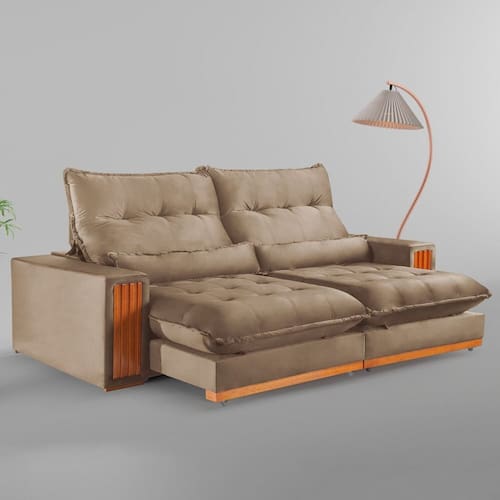 As almofadas vêm junto? Sim, vão duas. Acompanha Almofadas extras: Não Almofada do assento: Fixa Almofada do encosto: Fixa Altura do assento até o chão: 50 cm Altura do Encosto: 70 cm Altura dos Pés: 2,5 cm Ambiente Principal: Sala de Estar codigo_ean: 7900288143693 Cor: Bege Cor do Produto: Bege Densidade do Assento: D-26 Enchimento do Assento: Espuma Enchimento do Encosto: Fibra Siliconada Estilo de Braço: Braços Quadrados Firmeza do Assento: Macio Itens Inclusos: 1 Sofá Largura do Braço: 25 cm Marca: Kasacomigo Estofados Material dos Pés: Eucalipto Necessita Montagem: Não Origem do Produto: Nacional Peso: 88 kg Pet Friendly: Não Possui Baú: Não Possui Mola: Sim Possui Percintas Elásticas: Sim Possui Pés: 08 Possui Rodízio: Sim Profundidade Quando Estendido: 180 cm Quantidade de Estágios do Encosto: 6 Quantidade de Molas por Assento: 2 Recomendações de Uso, Manutenção e Limpeza: Pano úmido Rodízio com Trava: não Suporta Até (kg): 300 kg Tecido Predominante: Veludo Tipo de Encosto: Regulável Tipo de Mola: Molas Ensacadas Tipo de Sofá: Sofá Comum Marca: Kasacomigo Estofados