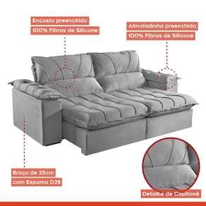 Escolher um bom sofá faz toda a diferença na sala de estar, não é? Para deixar seu ambiente receptivo e bem decorado, aposte no modelo 178! Ele conta com assento retrátil e encosto reclinável, que são ótimos na hora de esticar as pernas e curtir um filminho, tirar uma soneca depois do almoço ou simplesmente relaxar após um dia atarefado. E, para proporcionar mais aconchego aos seus momentos de lazer, é revestido em Veludo, tecido que confere maciez ao toque. Tudo isso composto em um visual clássico que destaca a coloração sóbria e torna o móvel fácil de harmonizar com os outros itens do cômodo. Daí, é só juntar todo mundo e curtir seu lar-style acolhedor ;) Acompanha Almofadas extras: Não Almofada do assento: Fixa Almofada do encosto: Fixa Altura do assento até o chão: 64 Altura do Encosto: 37 Altura dos Pés: 2.5 Ambiente Principal: Sala de Estar Complexidade da Montagem: Baixa: pode ser montado por uma pessoa sozinha Cor: Cinza Cor do Produto: Cinza Densidade do Assento: D-28 Densidade do Encosto: D-18 Enchimento do Assento: Espuma Enchimento do Encosto: Fibra Siliconada Estilo de Braço: Braços Pillow Top Firmeza do Assento: Firme Informações Complementares: Densidade De 28 Soft Itens Inclusos: 1 Sofá Material dos Pés: Madeira Necessita Montagem: Sim Origem do Produto: Nacional Peso: 109.5 Pet Friendly: Não Possui Percintas Elásticas: Sim Possui Pés: 04 Possui Rodízio: Sim Profundidade Quando Estendido: 160 Recomendações de Uso, Manutenção e Limpeza: Limpar com pano limpo e seco ou levemente umidecido em água. Limpeza também poderá ser realizada com aspirador de pó. Não utilizar produtos químicos. Revestimento do Braço: Veludo Rodízio com Trava: Não Sistema de Montagem: Encaixe Suporta Até (kg): 120 Tecido Predominante: Veludo Tipo de Encosto: Regulável Tipo de Mola: Molas Ensacadas (Molas ensacadas) Marca: Estofados Martins Ean: 7909903331538