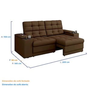Ficha Técnica Marca Besthouse Modelo Kansas Tipo Reclinável e retrátil Quantidade de lugares 2 lugares Tipo de encosto Reclinável Tipo de assento Retrátil Material da estrutura Madeira de eucalipto Braços Espuma D18 Altura 100 cm Largura Aberto: 205 cm Profundidade Aberto: 140 cm Fechado: 92 cm Peso 67,6 kg
