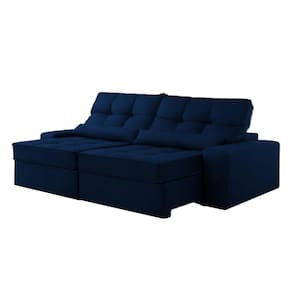 O revestimento em tecido com manta acrílica recebe costura com pesponto duplo, feito com máquinas de ponto eletrônico, proporciona beleza nos desenhos captonê e resistência da costura Acompanha Almofadas extras: Não Almofada do assento: Fixa Almofada do encosto: Fixa Altura do assento até o chão: 57 Altura do Encosto: 54 Altura dos Pés: 2.5 Ambiente Principal: Sala de Estar Complexidade da Montagem: Baixa: pode ser montado por uma pessoa sozinha Cor: Azul Cor do Produto: Azul Densidade do Assento: D-28 Densidade do Encosto: D-18 Enchimento do Assento: Hyper Soft Enchimento do Encosto: Fibra Siliconada Estilo de Braço: Braços Quadrados Firmeza do Assento: Macio Itens Inclusos: 1 Sofá, Kit Ferragens e Manual de Montagem Material dos Pés: Madeira Necessita Montagem: Sim Origem do Produto: Nacional Peso: 93.12 Pet Friendly: Não Possui Percintas Elásticas: Sim Possui Pés: 08 Possui Rodízio: Sim Profundidade Quando Estendido: 180 Recomendações de Uso, Manutenção e Limpeza: A limpeza do revestimento deve ser feita com escova ou tecido de algodão branco levemente umedecidos em água morna, sabão neutro ou produto específico. Não usar produtos corrosivos nem a base de solventes, como: cloro, alvejantes, detergentes, entre outros;Não expor o estofado à luz direta. Mantenha portas e janelas sempre protegidas com cortinas e blackout. A exposição contínua à radiação da luz, danifica o revestimento, apodrecendo os fios, trincando a superfície e desbotando as cores;Não lavar o revestimento das almofadas pois pode desfiá-las, abrindo as costuras;Não utilizar o estofado para fins diferentes do que foi projetado: ficar em pé, pular, arrastar, sentar nos braços, peso na caixa traseira, entre outros tipos de ações que poderão danificar o produto. Resistente à Chuva: Não Revestimento do Braço: Veludo Rodízio com Trava: Não Sistema de Montagem: Sim Suporta Até (kg): 120 Tecido Predominante: Veludo Tipo de Encosto: Regulável Tipo de Mola: Molas Espirais Ean: 7908551958920
