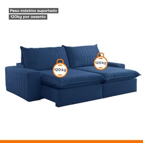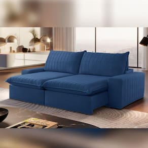 O revestimento em tecido com manta acrílica recebe costura com pesponto duplo, feito com máquinas de ponto eletrônico, proporciona beleza nos desenhos e resistência da costura Acompanha Almofadas extras: Não Almofada do assento: Fixa Almofada do encosto: Fixa Altura do assento até o chão: 56 Altura do Encosto: 60 Altura dos Pés: 2.5 Ambiente Principal: Sala de Estar Complexidade da Montagem: Baixa: pode ser montado por uma pessoa sozinha Cor: Azul Cor do Produto: Azul Densidade do Assento: D-28 Densidade do Encosto: D-18 Enchimento do Assento: Hyper Soft Enchimento do Encosto: Fibra Siliconada Estilo de Braço: Braços Quadrados Firmeza do Assento: Macio Itens Inclusos: 1 Sofá, Kit Ferragens e Manual de Montagem Material dos Pés: Madeira Necessita Montagem: Sim Origem do Produto: Nacional Peso: 104.16 Pet Friendly: Não Possui Percintas Elásticas: Sim Possui Pés: 08 Possui Rodízio: Sim Profundidade Quando Estendido: 180 Recomendações de Uso, Manutenção e Limpeza: A limpeza do revestimento deve ser feita com escova ou tecido de algodão branco levemente umedecidos em água morna, sabão neutro ou produto específico. Não usar produtos corrosivos nem a base de solventes, como: cloro, alvejantes, detergentes, entre outros;Não expor o estofado à luz direta. Mantenha portas e janelas sempre protegidas com cortinas e blackout. A exposição contínua à radiação da luz, danifica o revestimento, apodrecendo os fios, trincando a superfície e desbotando as cores;Não lavar o revestimento das almofadas pois pode desfiá-las, abrindo as costuras;Não utilizar o estofado para fins diferentes do que foi projetado: ficar em pé, pular, arrastar, sentar nos braços, peso na caixa traseira, entre outros tipos de ações que poderão danificar o produto. Resistente à Chuva: Não Revestimento do Braço: Veludo Rodízio com Trava: Não Sistema de Montagem: Sim Suporta Até (kg): 120 Tecido Predominante: Veludo Tipo de Encosto: Regulável Tipo de Mola: Molas Espirais Ean: 7908551958760